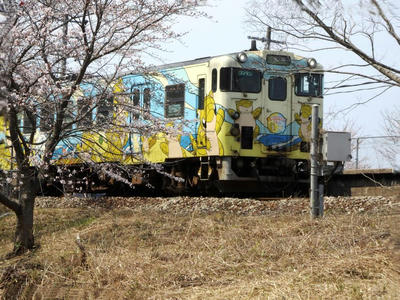 ▲ 大岩駅は無人駅ですが15台ほどの駐車場があり、ホームにはカメラを持った方も何人かいました。桜の花と2両編成の特別ラッピング列車の写真を一枚。PR -